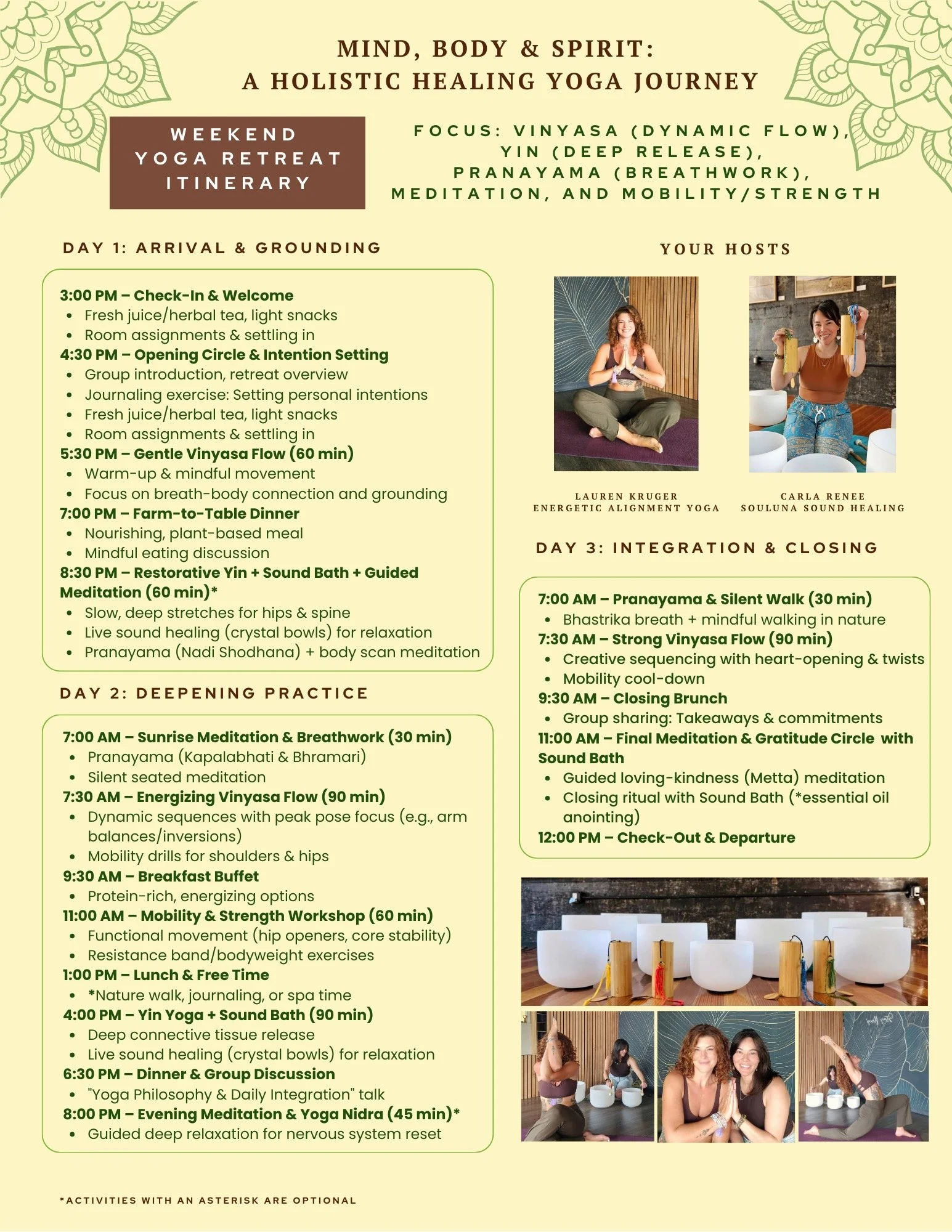 This is a three-day, in-person exclusive yoga retreat. Featuring yoga classes, sound bath healing and meditation workshops. Location and dates TBD.